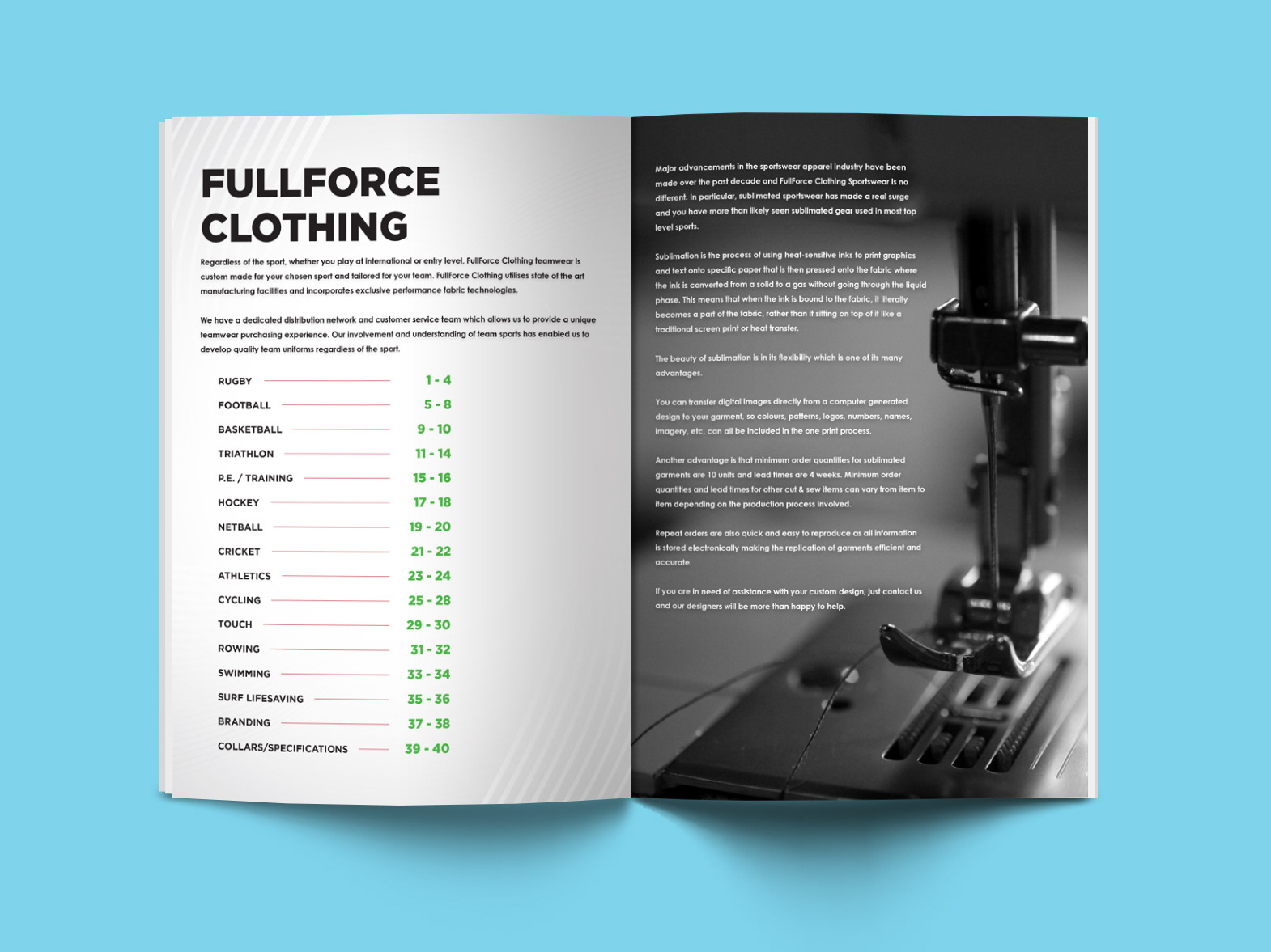 Relayout of 2016 Sports and Teamwear Catalog for Full Force Clothing, Australia
